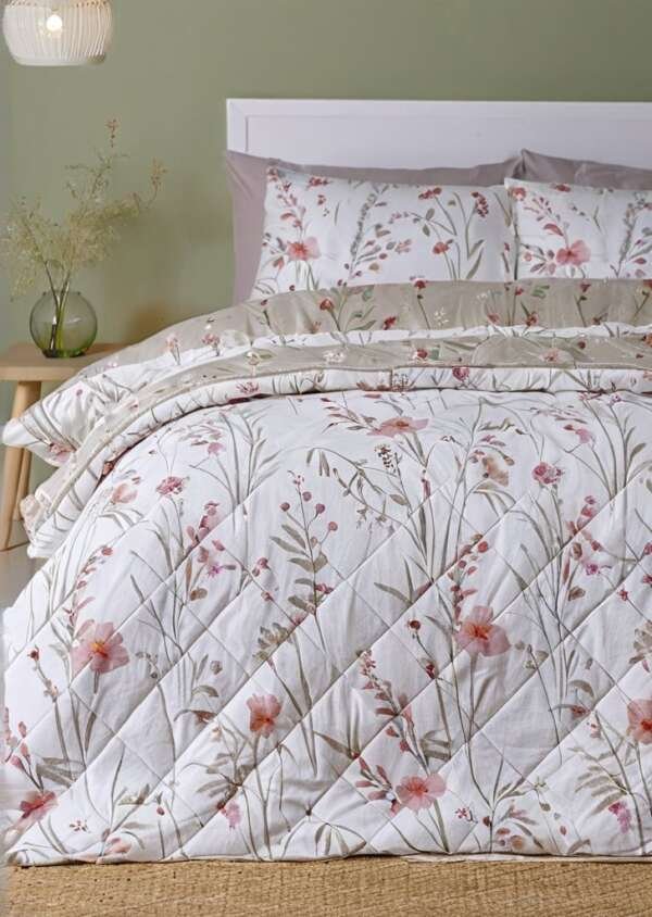 Dwustronna pikowana narzuta z bawełny w kwiaty szczotkowana Grasmere w kolorze zielonym