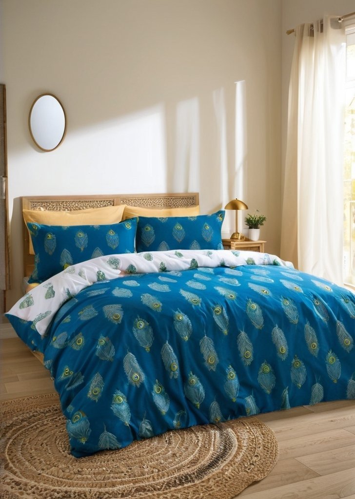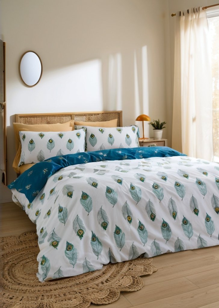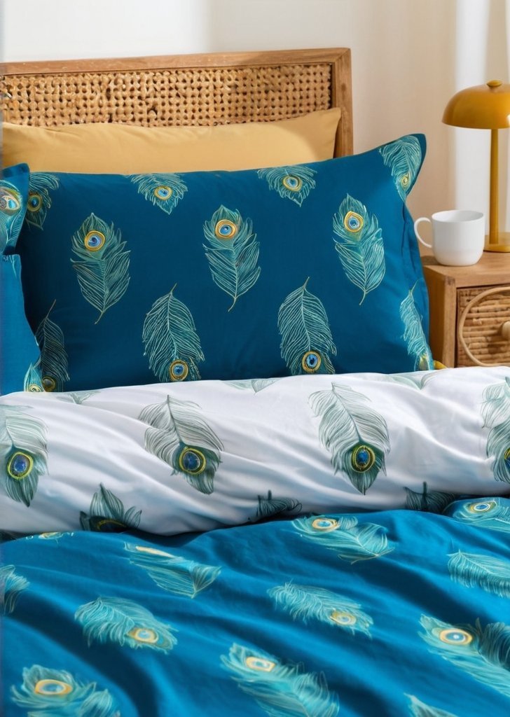 Przenieś sią do świata elegancji dziąki temu zestawowi pościeli z pawich piór, zaprojektowanemu tak, aby wnieśąć do Twojej sypialni odrobiną ponadczasowego uroku. Bogaty turkusowy przód, ozdobiony misternymi motywami piór, stwarza wrażenie bogactwa, podczas gdy czysty biały tył z delikatnymi detalami z piór zapewnia świeży i wszechstronny wygląd. Wykonany w 100% z bawełny, ten komplet pościeli jest piąknie miąkki, oddychający i delikatny dla skóry, zapewniając chłód i wygodą przez całą noc.