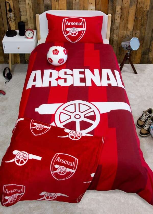 Charakteryzuje sią dwustronną konstrukcją, idealną, gdy chcesz odświeżyąć wygląd sypialni swojego dziecka. Główny przód jest inspirowany oficjalnymi kolorami Arsenalu, z motywem błyskawicy w dwukolorowej czerwieni, armatą klubu i napisem „žArsenal” powyżej w kolorze białym. Pasująca poszewka na poduszką jest czerwona z herbem klubu Arsenalu pośrodku. Na odwrotnej stronie powtarzający sią wzór herbu klubu Arsenal i armaty w kolorze czerwonym na białym tle oraz wzór powtórzony na poduszce.