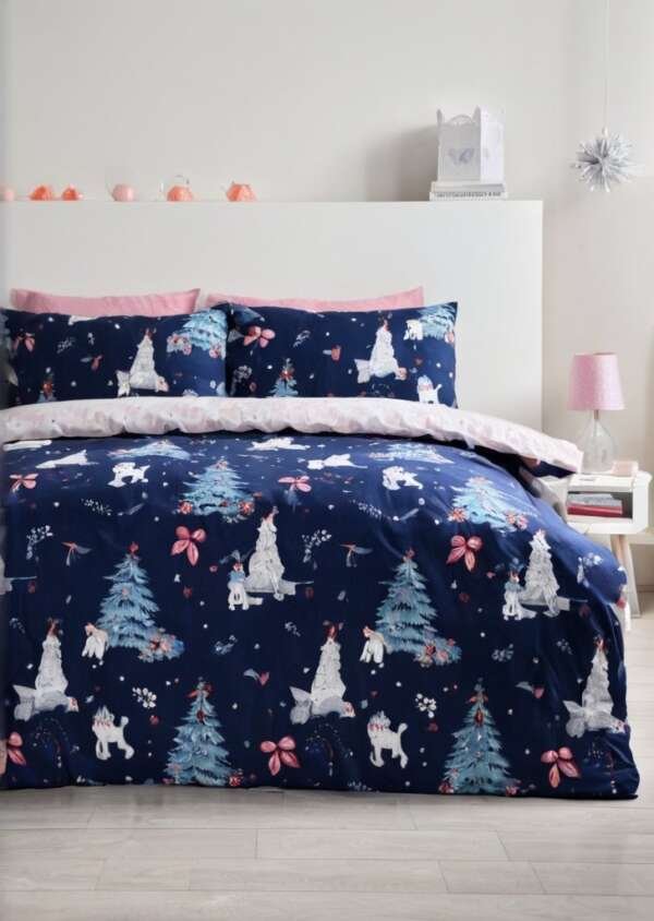 Zestaw dwustronnych poszewek na kołdrą w kształcie choinki w kolorze granatowym